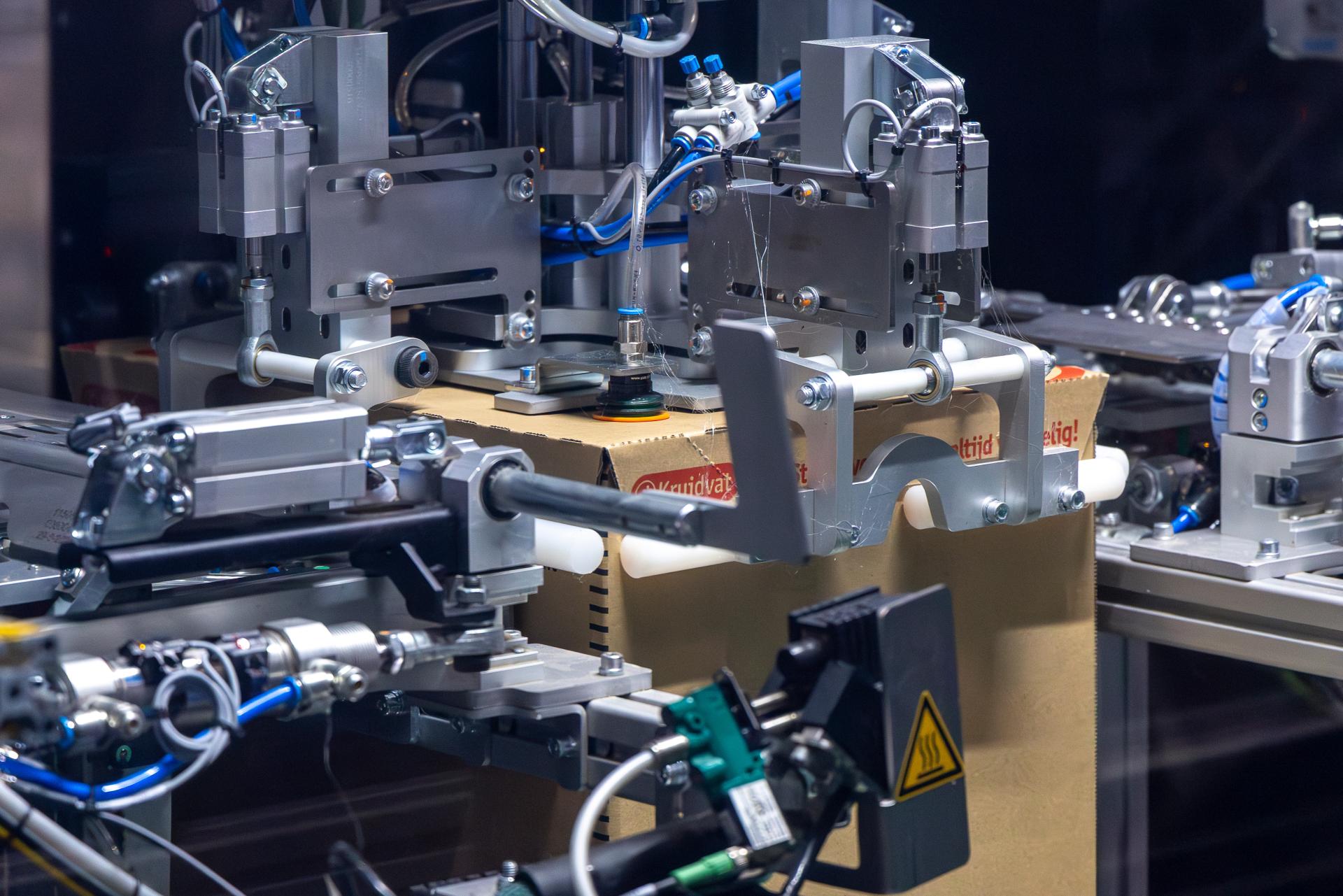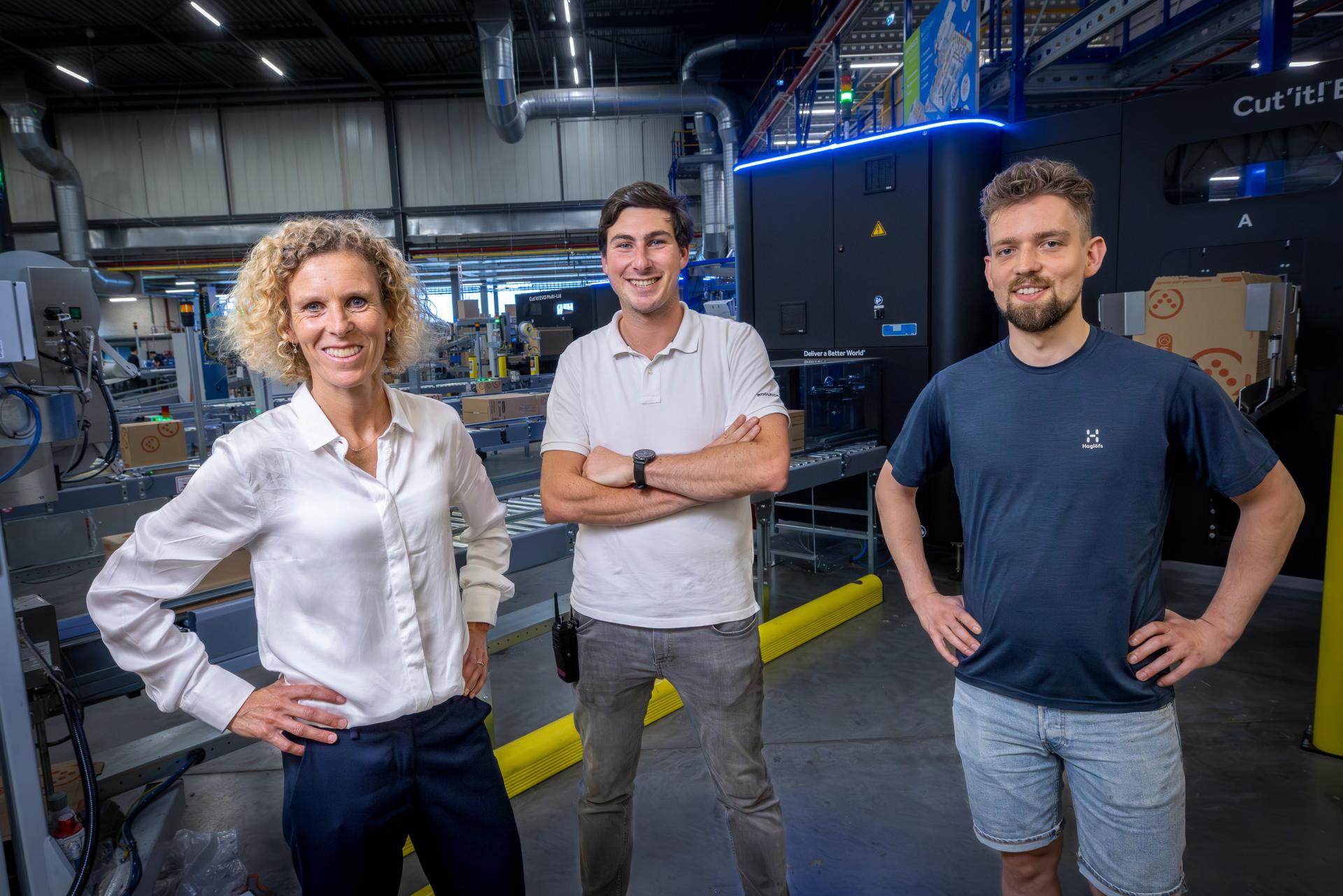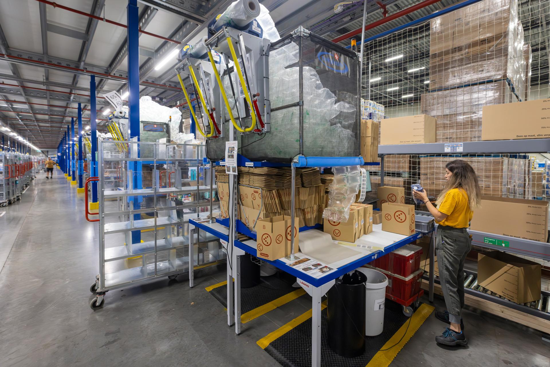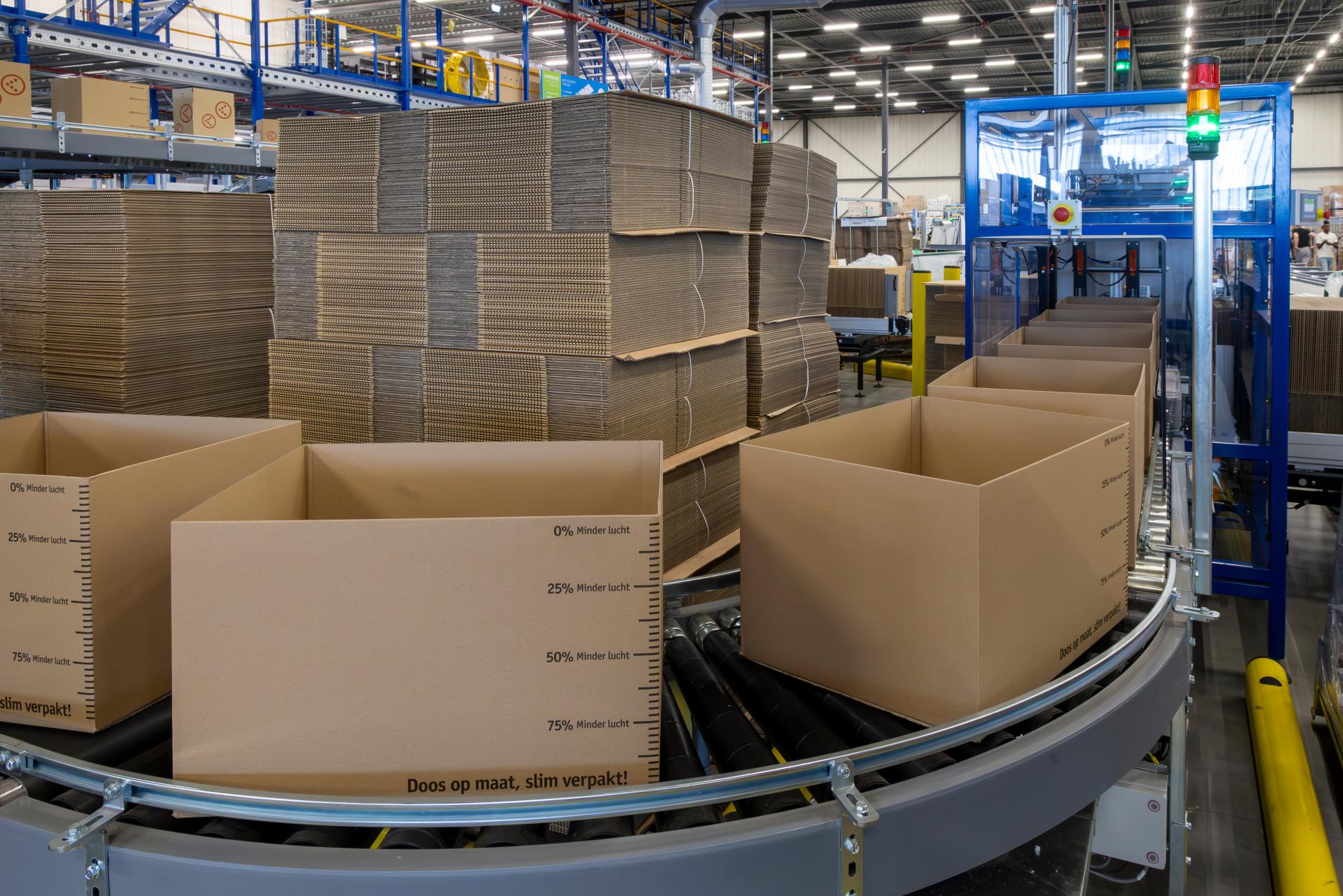 Het proces is aangevuld met acht machines, laat teamleider Siem van de Camp in het Edese e-fulfilmentcentrum zien. Ten eerste zijn er vier dozenopzetters: een per ‘grondformaat’ per inpakstraat. Elke doos krijgt een sticker aan de onderkant. Doordat deze sticker bij elke stap in het verpakkingsproces wordt gescand, weet het systeem welke order erin verpakt zit en wat de volgende stap moet zijn. De medewerker krijgt bij het inpakstation advies van het doosalgoritme welk formaat doos hij of zij moet pakken, en gaat de producten vervolgens zo laag mogelijk stapelen. Ze moeten een soort tetris op de bodem spelen, zegt De Looze.