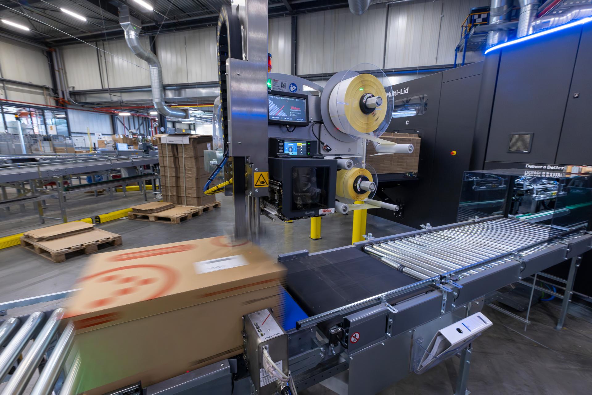 Voor het dichtmaken van de grote dozen zijn er twee Ranpak-machines, die het karton op de juiste hoogte insnijden, vouwen en een deksel plaatsen. Afhankelijk van de order, is dit een Kruidvat- of Trekpleister-deksel. Twee Lantech-machines plakken op hun beurt de kleinere dozen dicht met een dun lijmlaagje.
